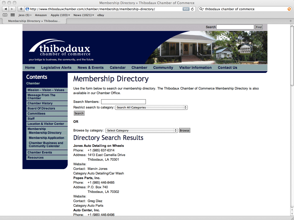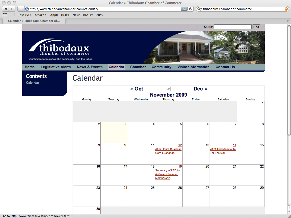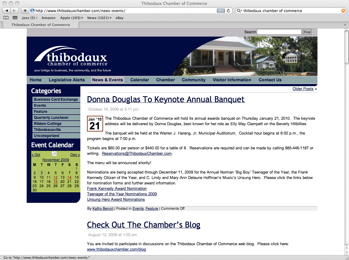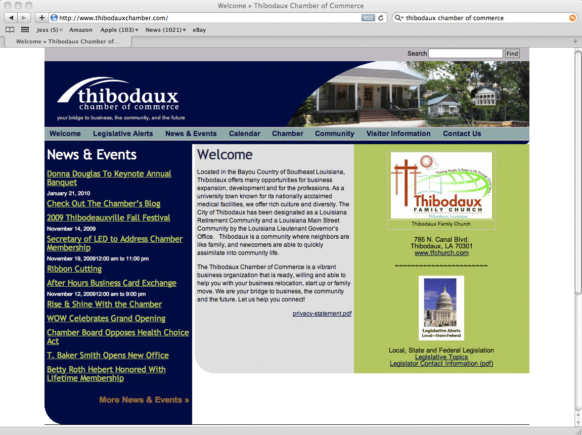 This version of the website is similar to the original work, but the design was modified to allow the Thibodaux Chamber staff to make more modifications to the site. It is always interesting to see how clients modify websites to meet their current needs. Allowing these modifications can cause some disruptive design changes to the original ideas, but it gives clients the ability to use the site how they need to communicate. Besides, at a later date I can always use their ideas to make the design more effective while blending in the clients needs.